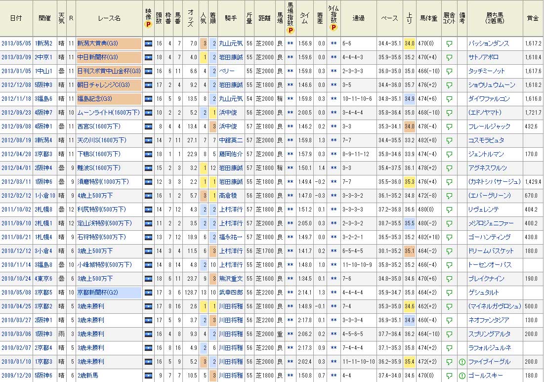 昨年(2012年)の9月から青いのばっかりですね。シルバーコレクターってレベルじゃない見事な2着っぷりでファンからすると「むしろ勝たなくていい」とまで言われていています。